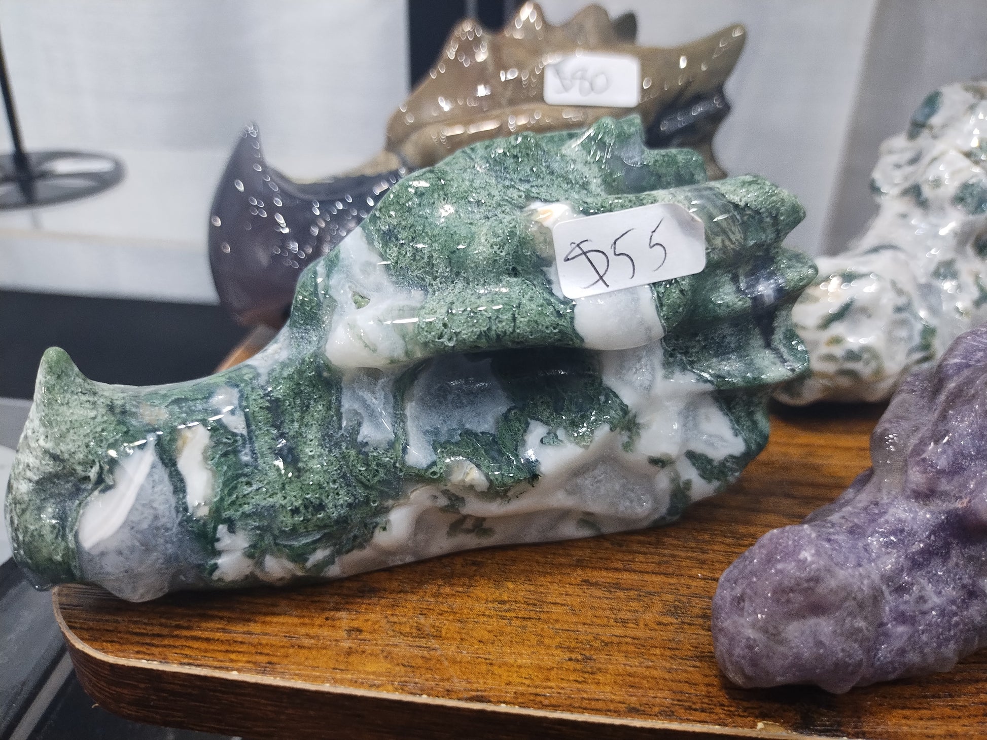 Featuring stunning moss agate and a detailed dragon design, this unique piece adds a touch of magic to any space. Perfect for dragon lovers and crystal enthusiasts alike. (No actual dragons were harmed in the making of this product).