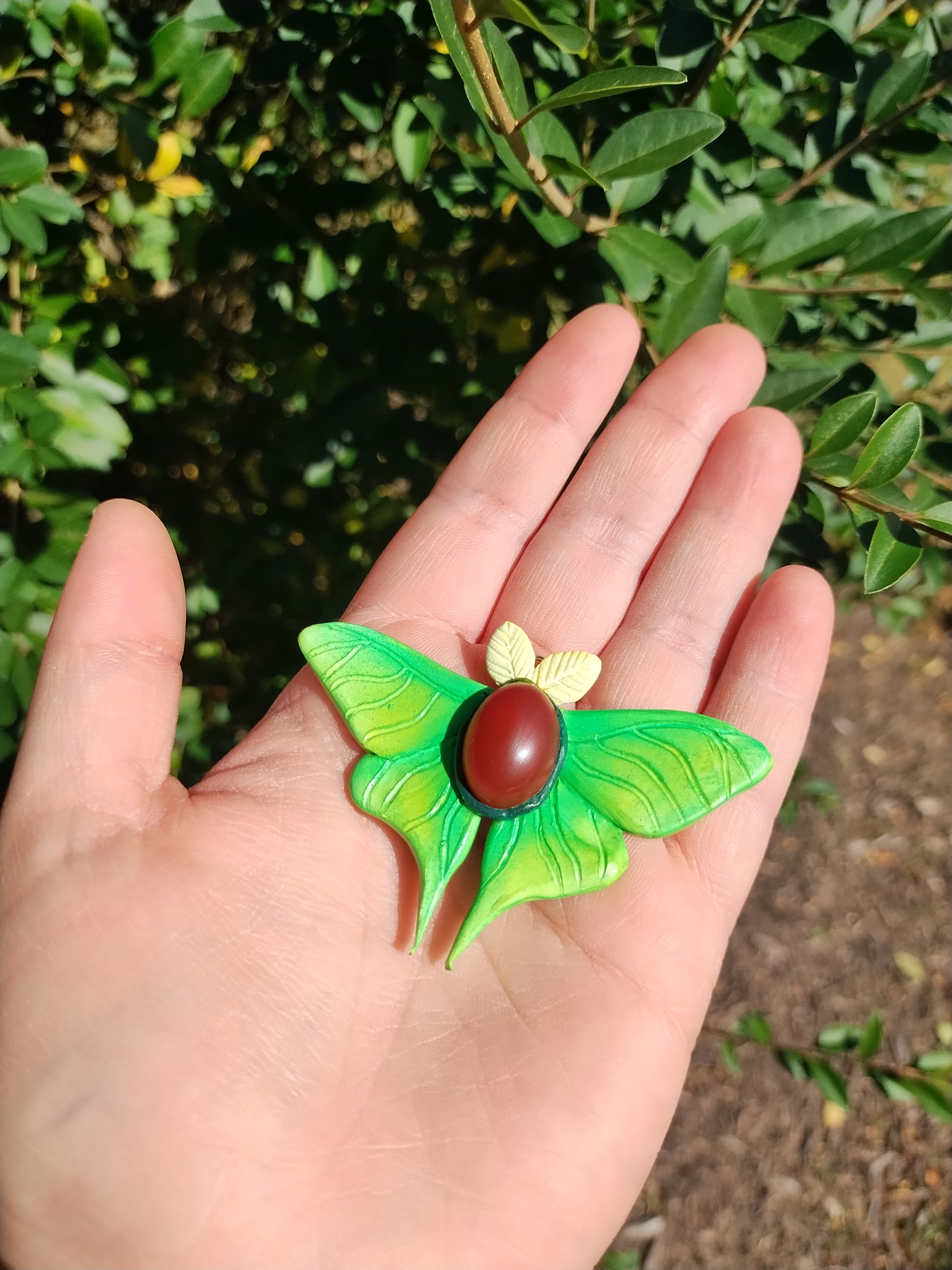 Add a whimsical touch to any outfit with our Green Luna Moth Necklace. Each pendant is handcrafted, making each piece unique, embedded with a beautiful carnelian gemstone in its heart. This playful necklace is perfect for nature lovers and will surely spark compliments. (No two are alike!)