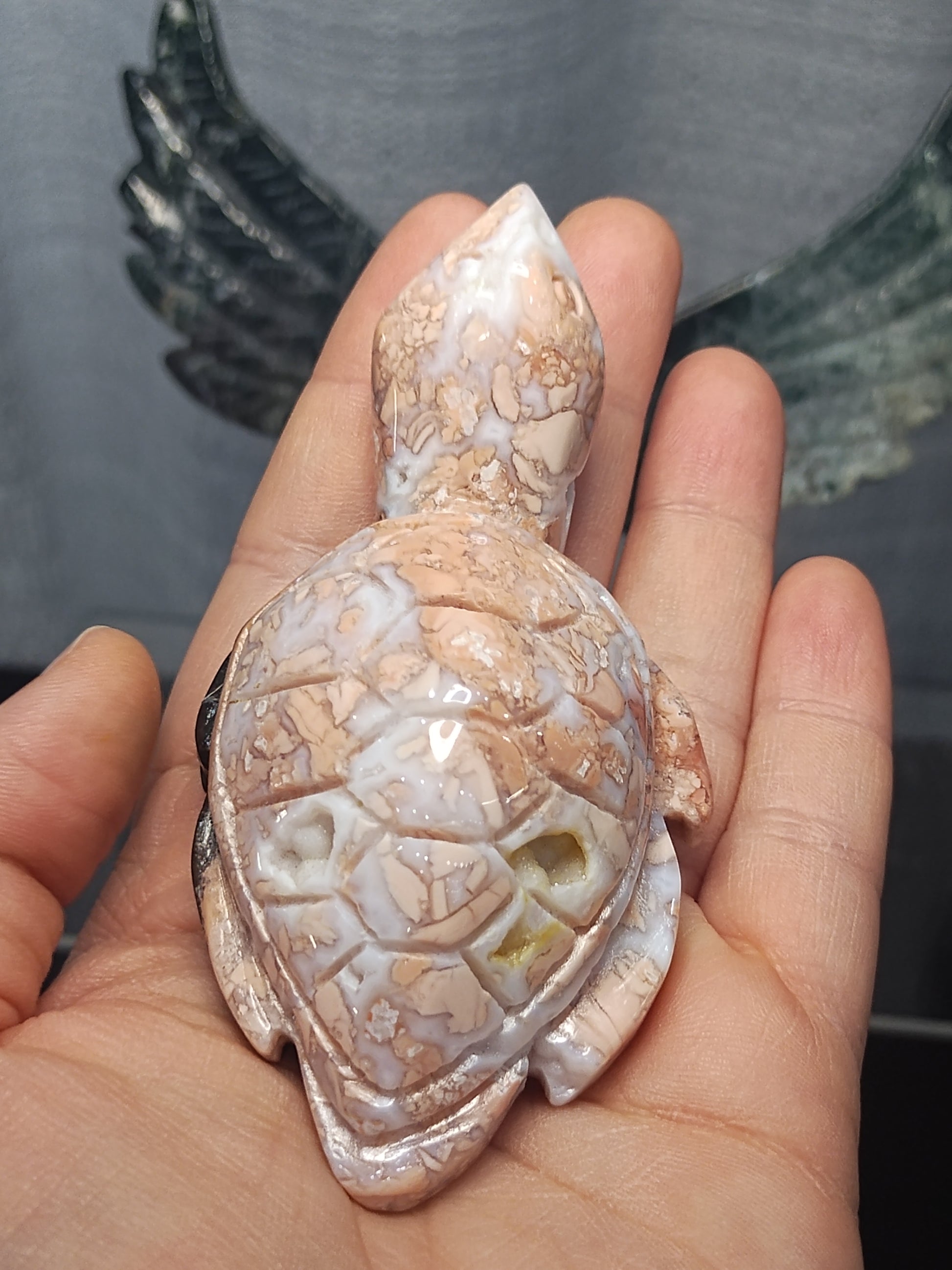 Introduce a touch of nature and elegance to your home decor with our Pink Agate Turtle. Handcrafted from beautiful pink agate, this turtle carving is a unique and stunning addition to any room. With its delicate details and natural color variations, it's a perfect representation of the beauty and diversity found in nature. Bring a sense of tranquility and positivity into your space with this charming piece.